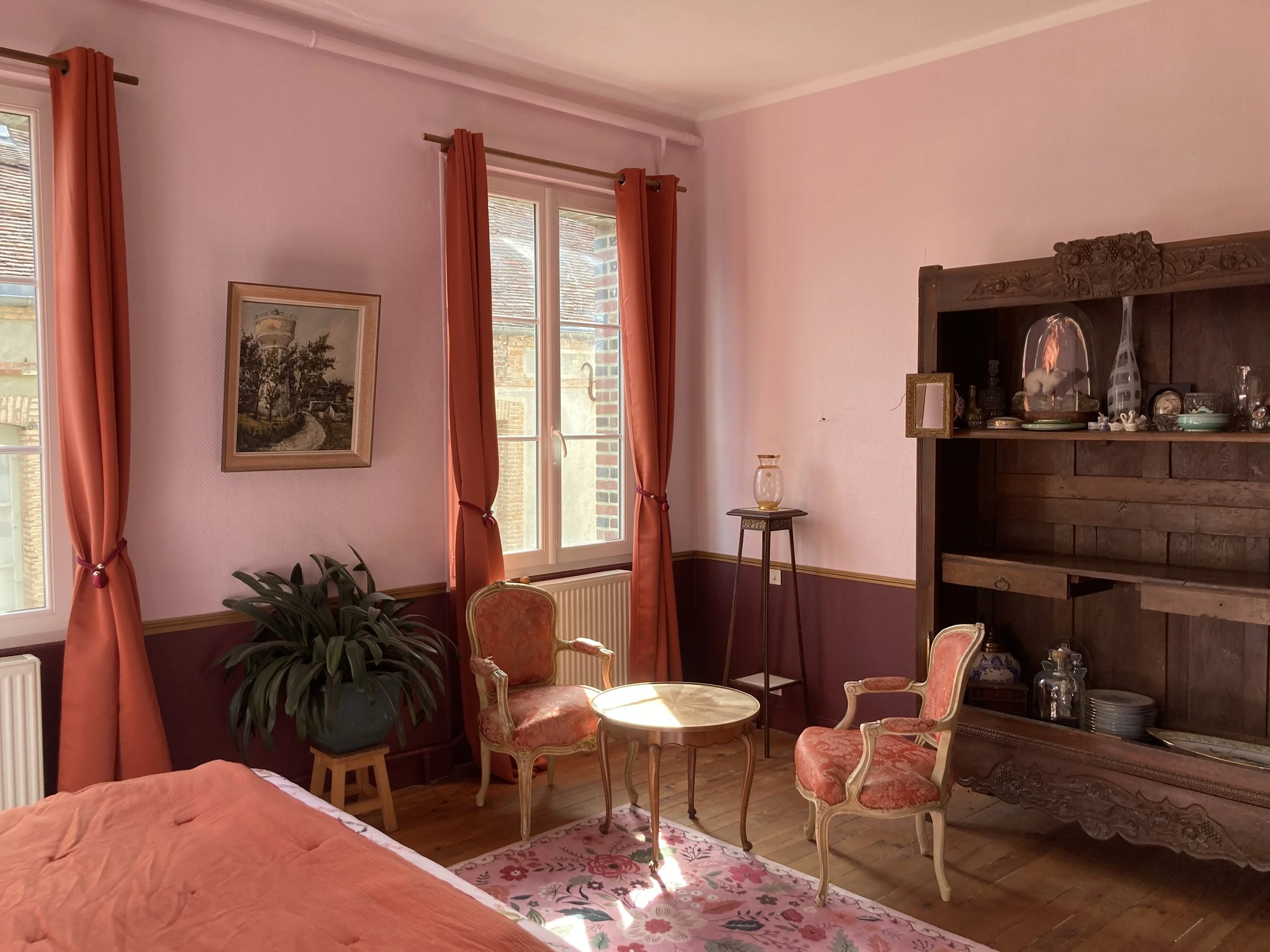 La pièce mêle mobilier ancien, tissus colorés et objets chinés, dans un esprit de maison de campagne élégante et vivante.